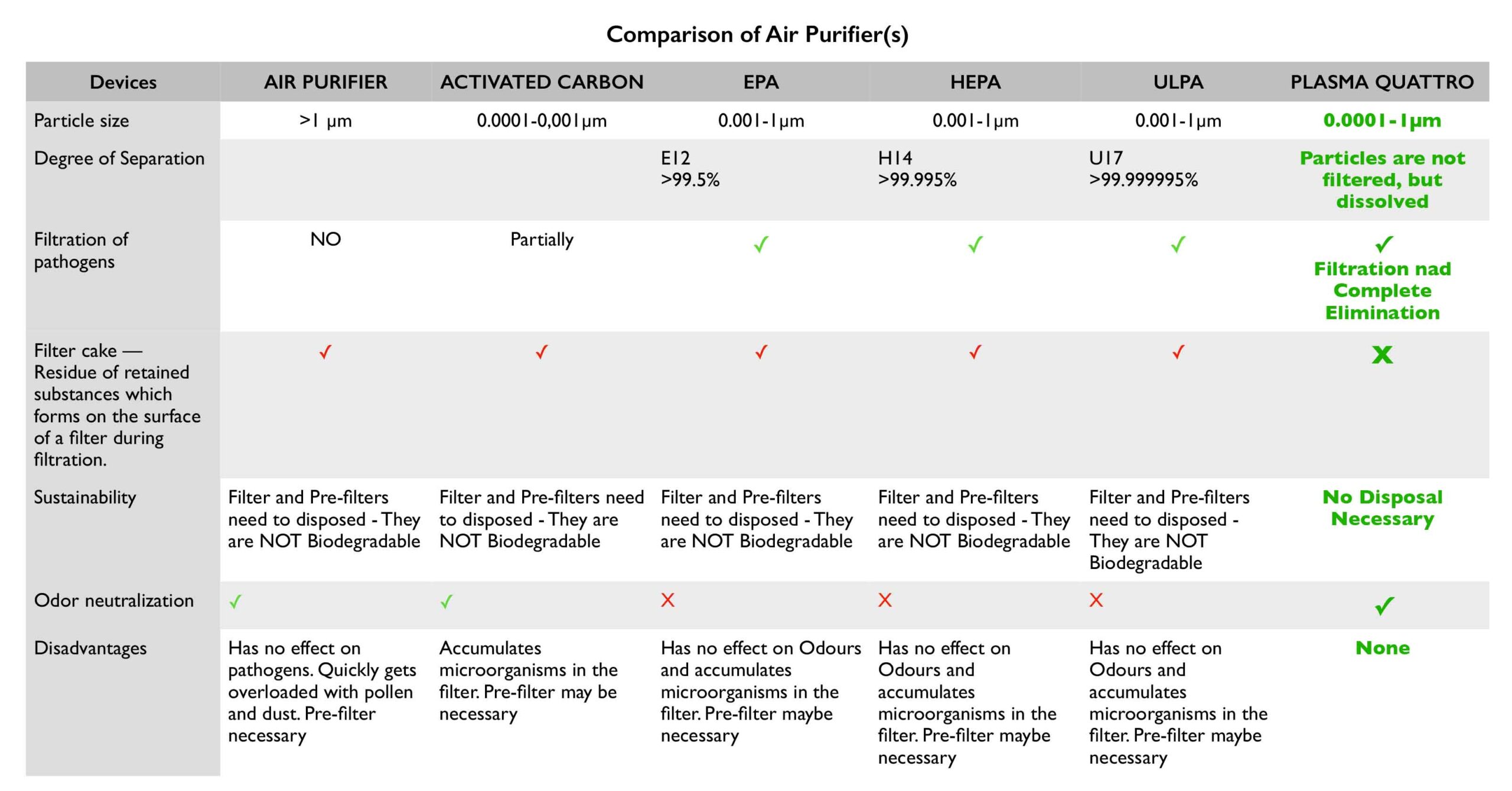 Here is a comparison of some of the commonly uses filters vs AIRsteril’s Plasma Quattro